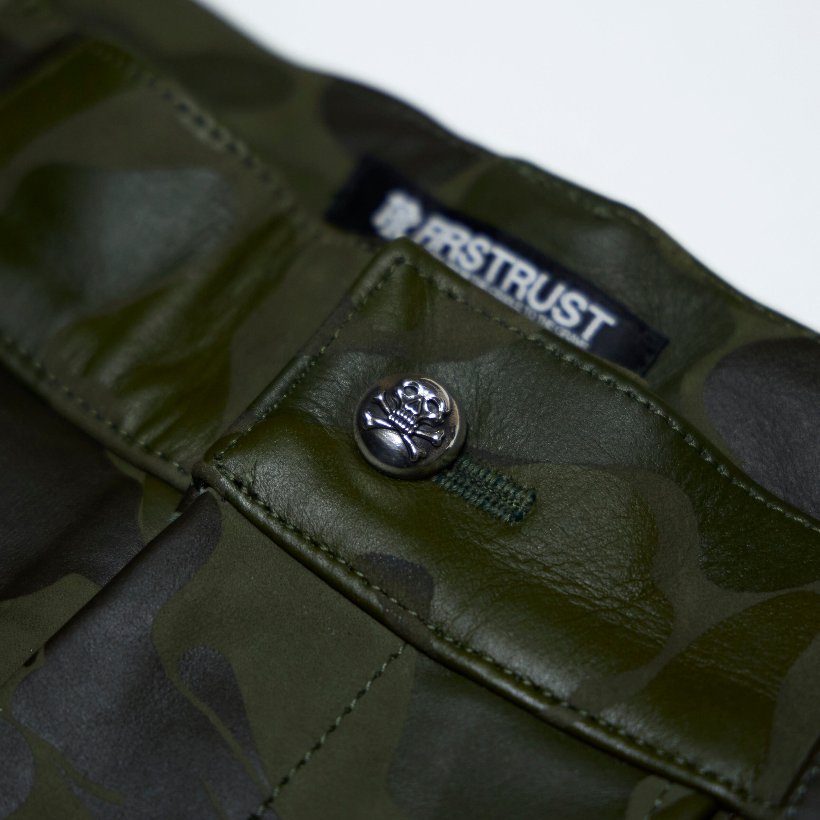 FIRSTRUST®︎レーベルオリジナルの"ピンナップ・カモフラージュ"を配した、オリジナリティー溢れるデザインが特徴的で、今と昔をひと繋ぎに“これまでに無かったモノ”を追求したレザーパンツ。