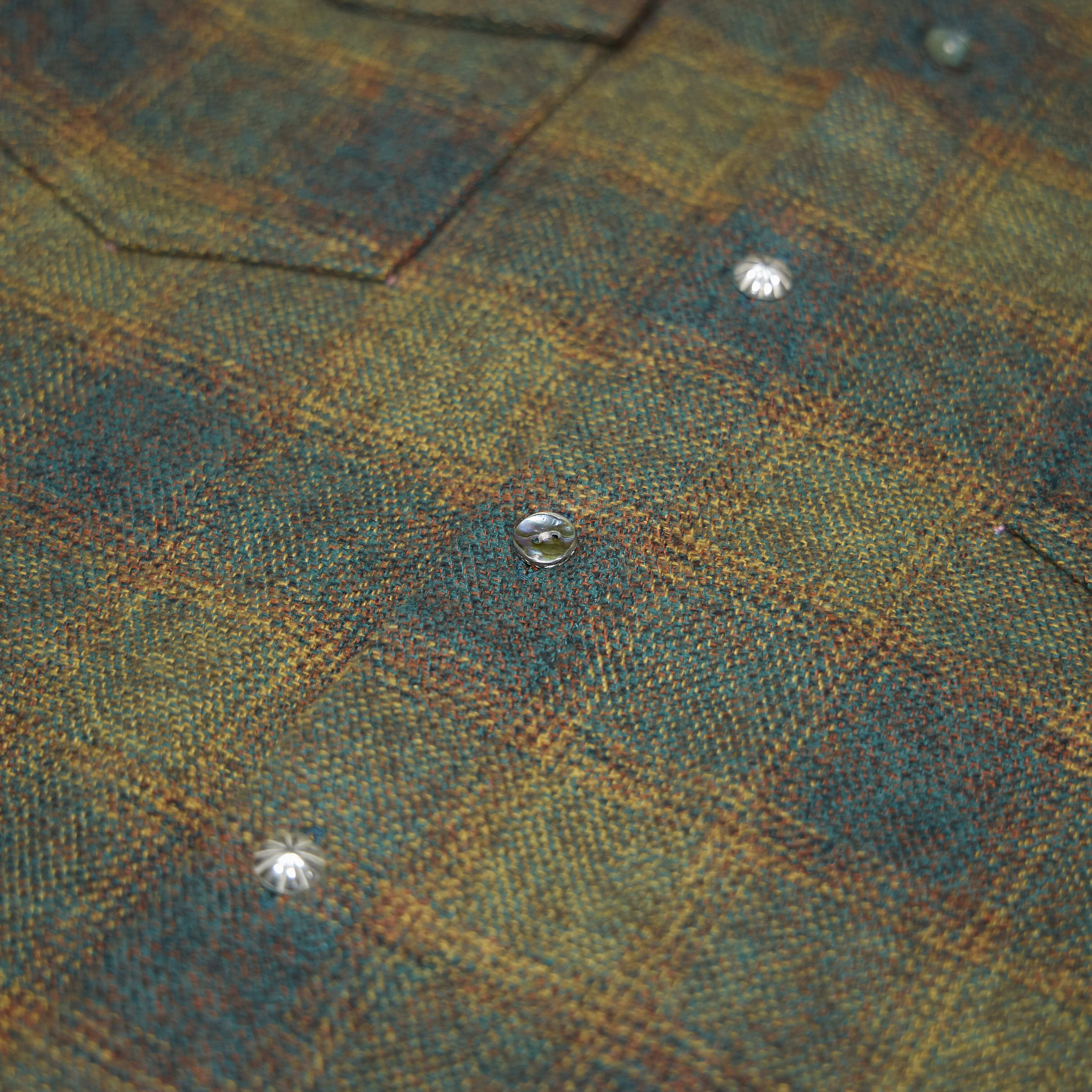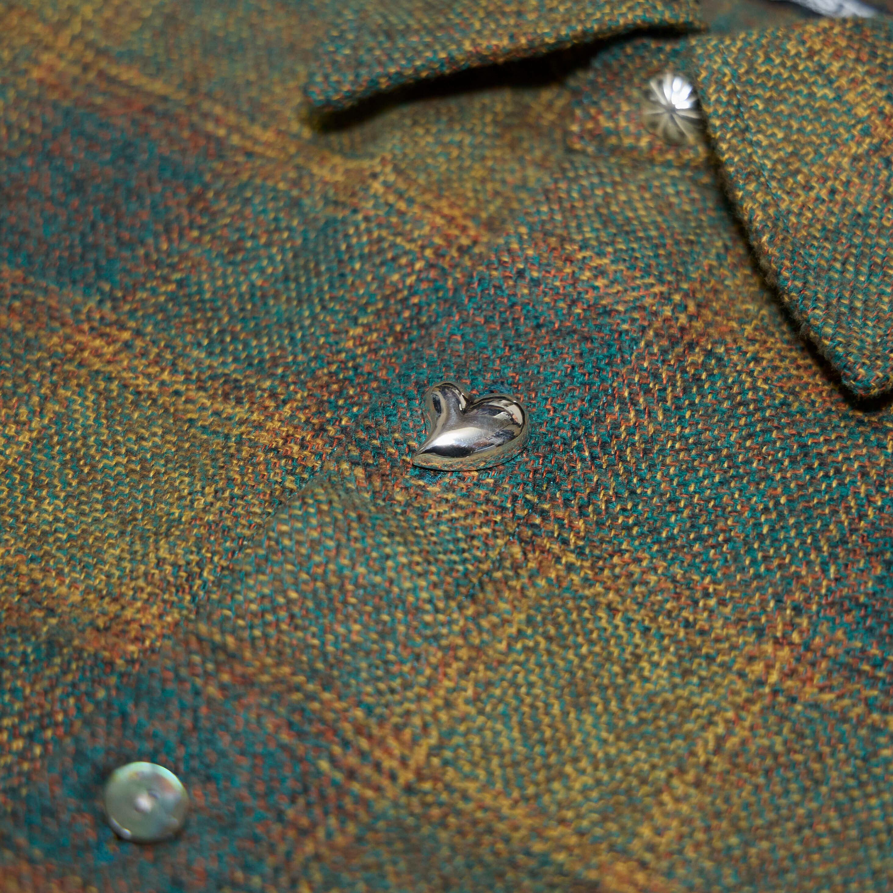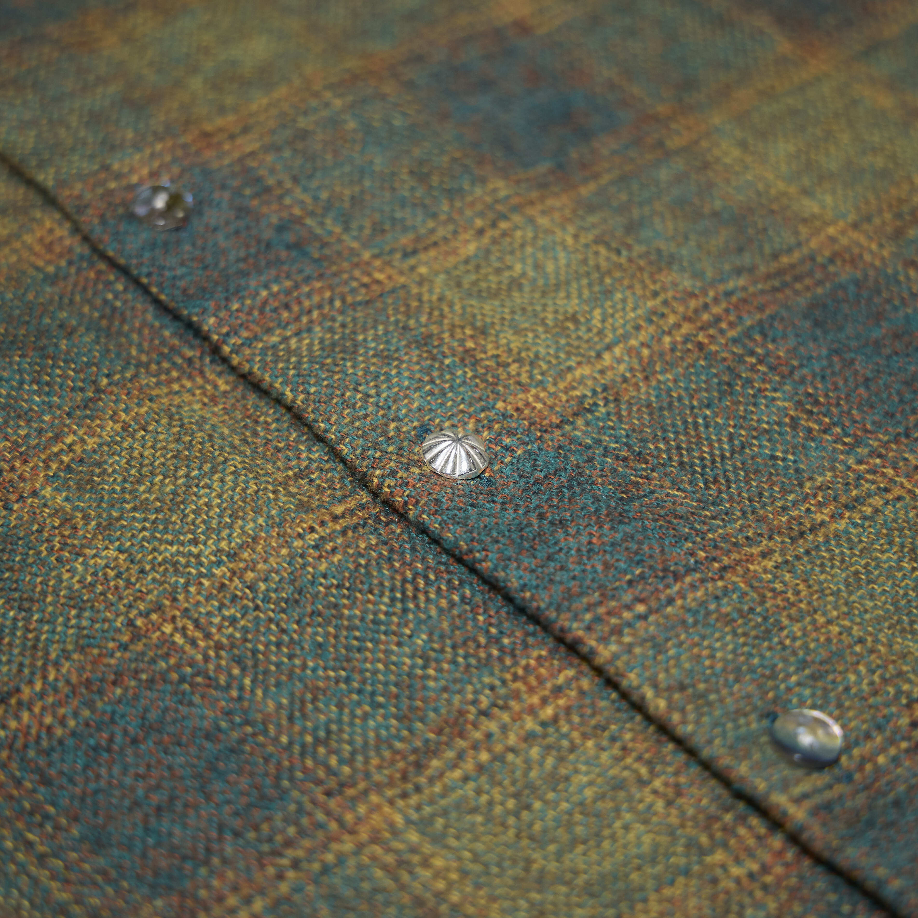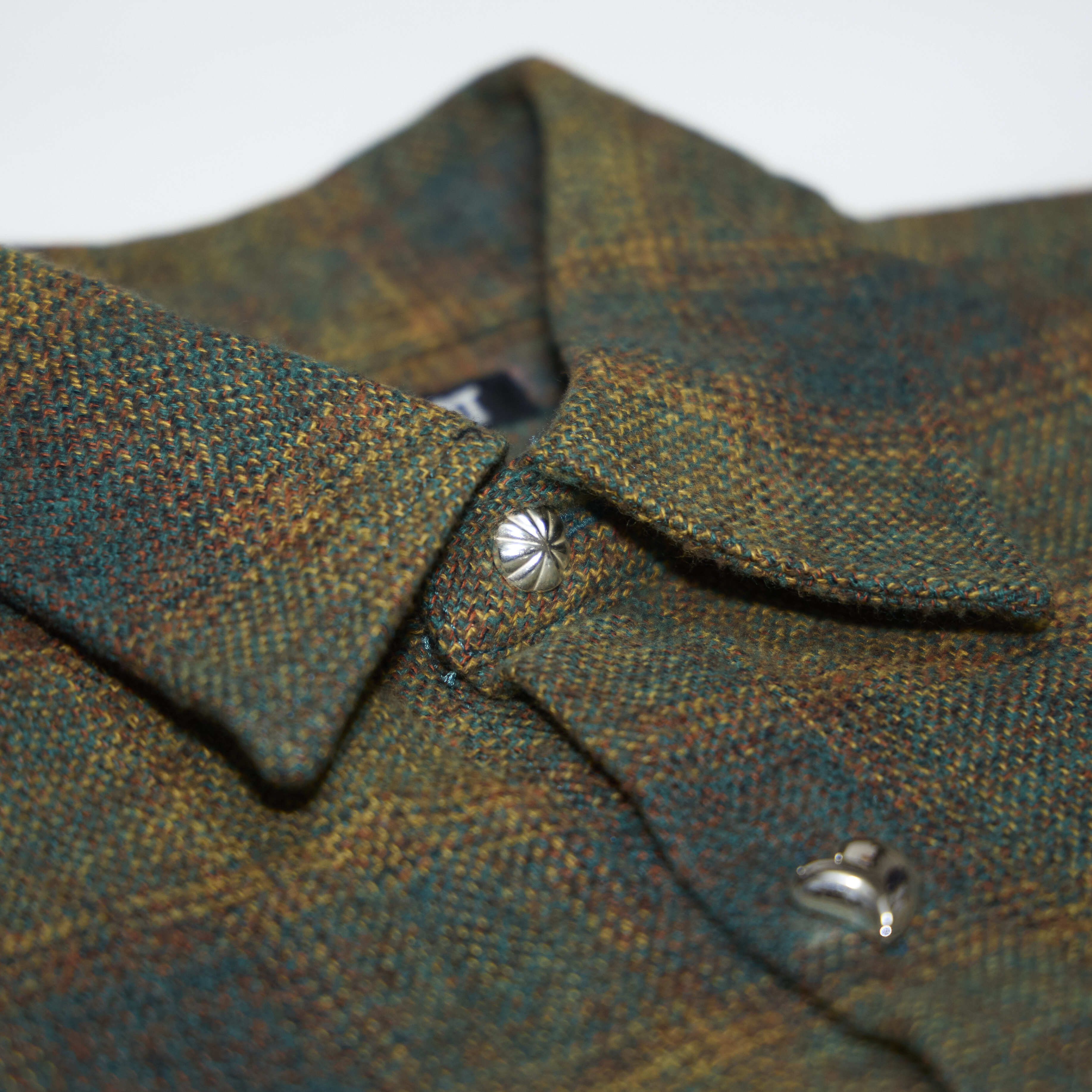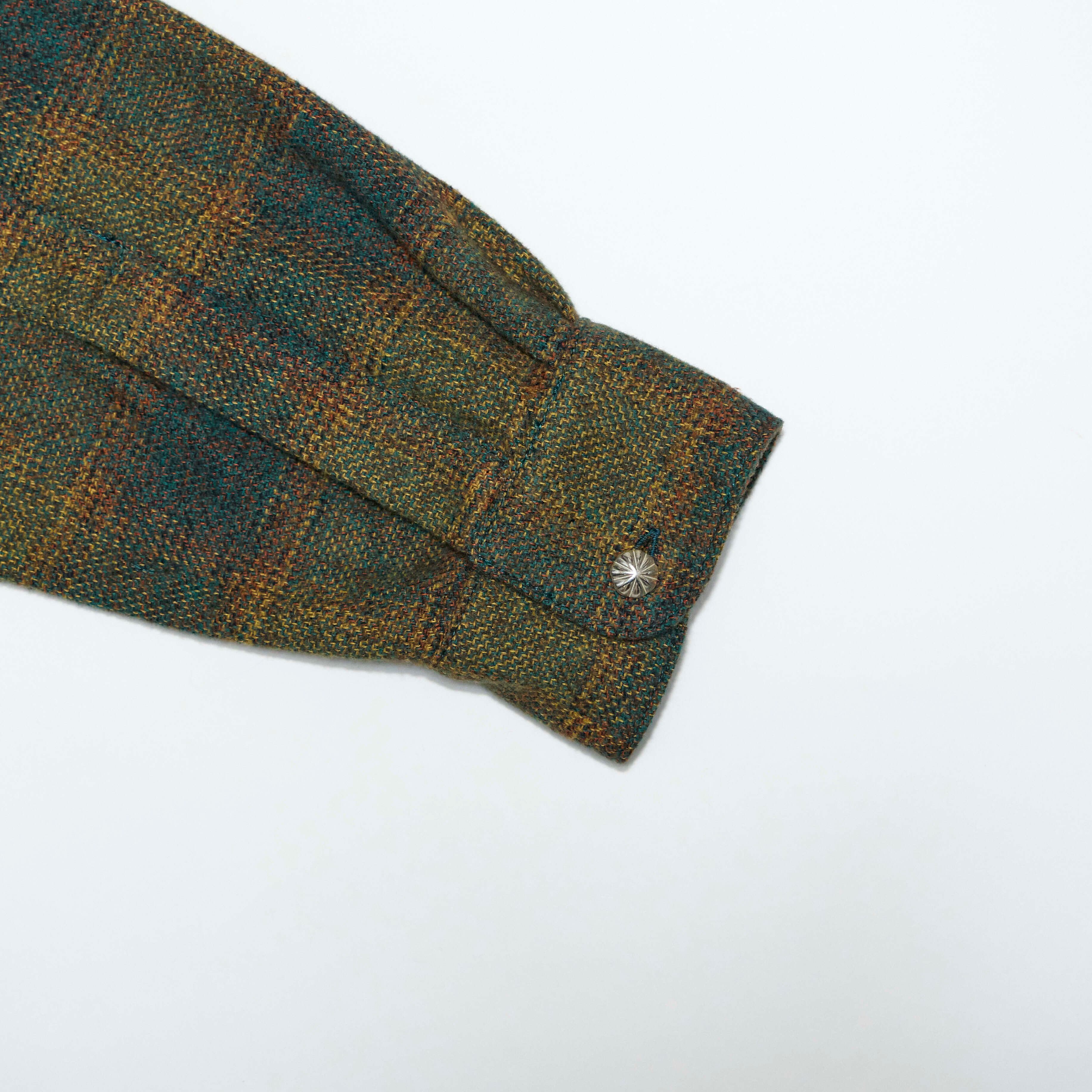 フロントと袖口にコンチョボタンとシェルボタンをコンビネーションで配し、