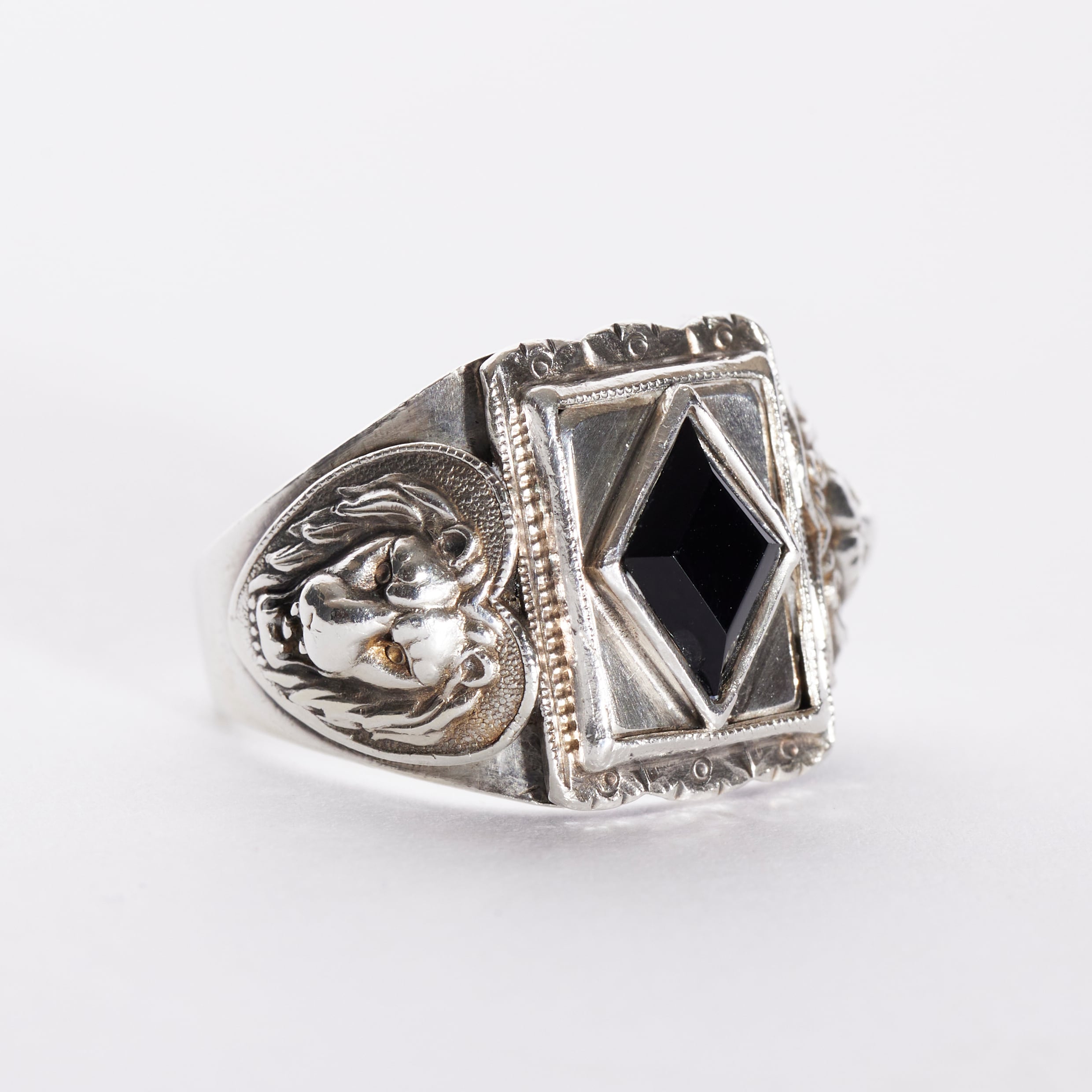 造形の中石に、ハーレークイン型にロゼンジ・カットした大振りのオニキスをスタンバイ。